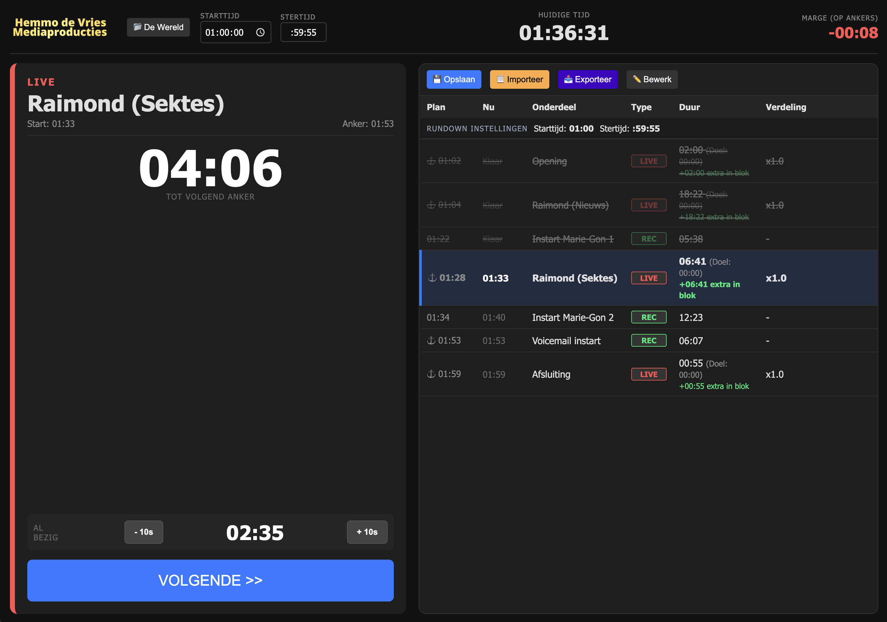 Houdt de regisseur bij de les tijdens een liveuitzending: laad het rundown en de tool toont realtime hoeveel tijd elk onderdeel kost en of de show nog op schema ligt.